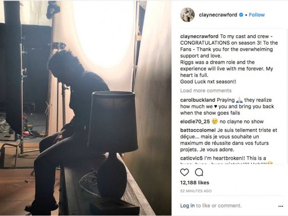Недавно в инстаграме правонарушителя появилась фотография, на которой поникший Кроуфорд в одиночестве сидит на комоде. Актер оставил подпись: «Поздравляю коллег и команду с третьим сезоном! Всех фанатов хочу поблагодарить за ошеломляющую поддержку и любовь. Риггз был персонажем мечты, и этот опыт навсегда останется со мной. Эмоции переполняют. Удачи в следующем сезоне!».