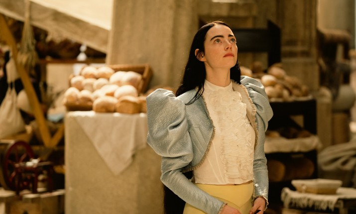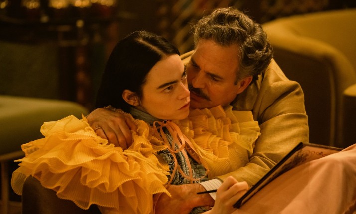 Художница по костюмам Холли Уоддингтон («Великая») подчеркивала трансформацию героини от кадра к кадру, наряжая ее то в фривольные мини-юбки и блузы с рукавами-буф, то делая ее образ подчеркнуто строгим. Заметьте, Белла вопреки моде того времени не носит корсет, в отличие от героя Руффало, которого внутренние комплексы заставляют рядиться в подобие брони. Белла же демонстрирует полное пренебрежение не только к веяниям моды, но и к социальным правилам, постоянно забывая некоторые предметы своего туалета и до середины фильма нося роскошную гриву волос.